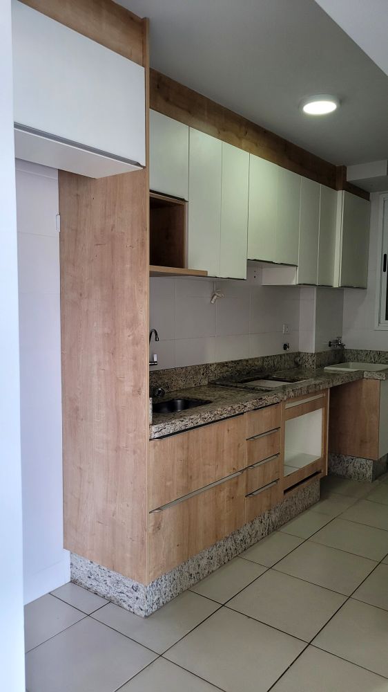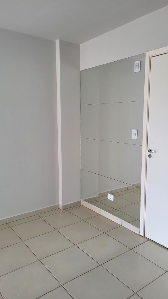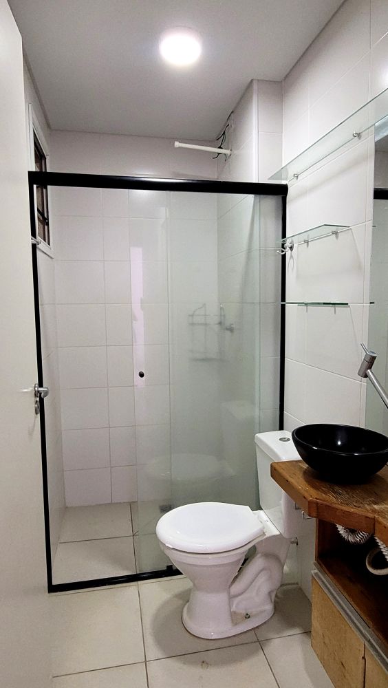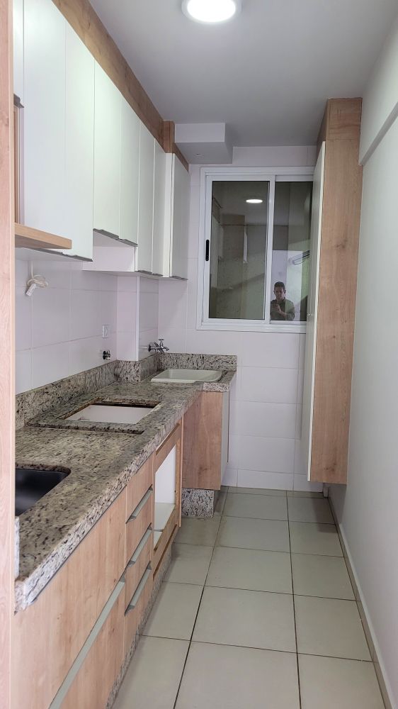 Apartamento com cozinha planejada, sala com painel de tv, sala de jantar com espelhos, 2 quartos, banheiro com box e armários e mais 1 vaga coberta.